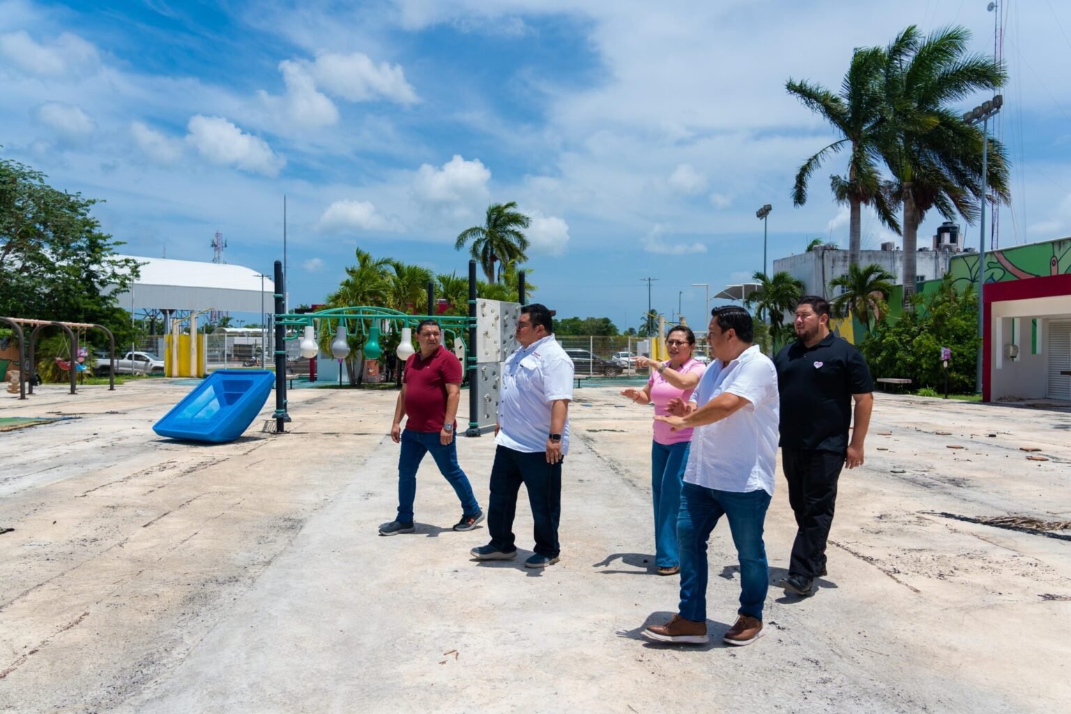 Durante la visita acompañado de Diana Sosa Blanco, presidenta honoraria del DIF Cozumel, se destacó que la rehabilitación incluye renovación total de las estaciones de juego, cambio de piso de caucho para mayor seguridad, baños accesibles, nuevas luminarias y trabajos de albañilería, herrería, pintura y jardinería.